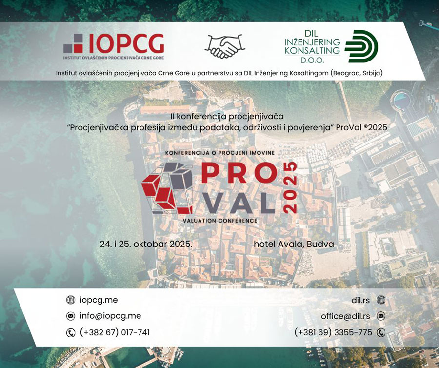 U okviru pilot projekta partnerstva između IOPCG – Institut Ovlašćenih Procjenjivača Crne Gore/The Institute of Certified Valuers of Montenegro i DIL Inženjering Konsalting (DIL GROUP) pozivamo vas da se prijavite i učestvujete na drugoj konferenciji o procjeni imovine – ProVal 2025, sa temom: